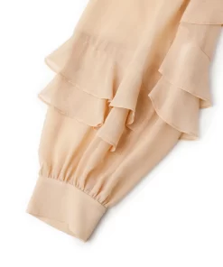 MARYLINGThisapricot-coloredstitchtopisdesignedwiththinandsoftsilkgeorgettefabricandruffles,showingtheromanticandgentlefemininityofautumnandwinter.FitTruetosize,chooseyournormalsizeCompositionKnitmaterial:100%sheepwoolWovenmaterial:100%mulberrysilkWashingmethodHandwashMaxwashingtemperature40¡æDonotbleachLayflattodryIronsoleplatemaximumtemperature110¡æMilddrycleaningNote:SeparatewaterwashingOnlywool-silkdetergentcanbeusedReminder:Payattentiontomoisture-proofandmoth-proofwhenstoring