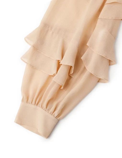 MARYLINGThisapricot-coloredstitchtopisdesignedwiththinandsoftsilkgeorgettefabricandruffles,showingtheromanticandgentlefemininityofautumnandwinter.FitTruetosize,chooseyournormalsizeCompositionKnitmaterial:100%sheepwoolWovenmaterial:100%mulberrysilkWashingmethodHandwashMaxwashingtemperature40¡æDonotbleachLayflattodryIronsoleplatemaximumtemperature110¡æMilddrycleaningNote:SeparatewaterwashingOnlywool-silkdetergentcanbeusedReminder:Payattentiontomoisture-proofandmoth-proofwhenstoring