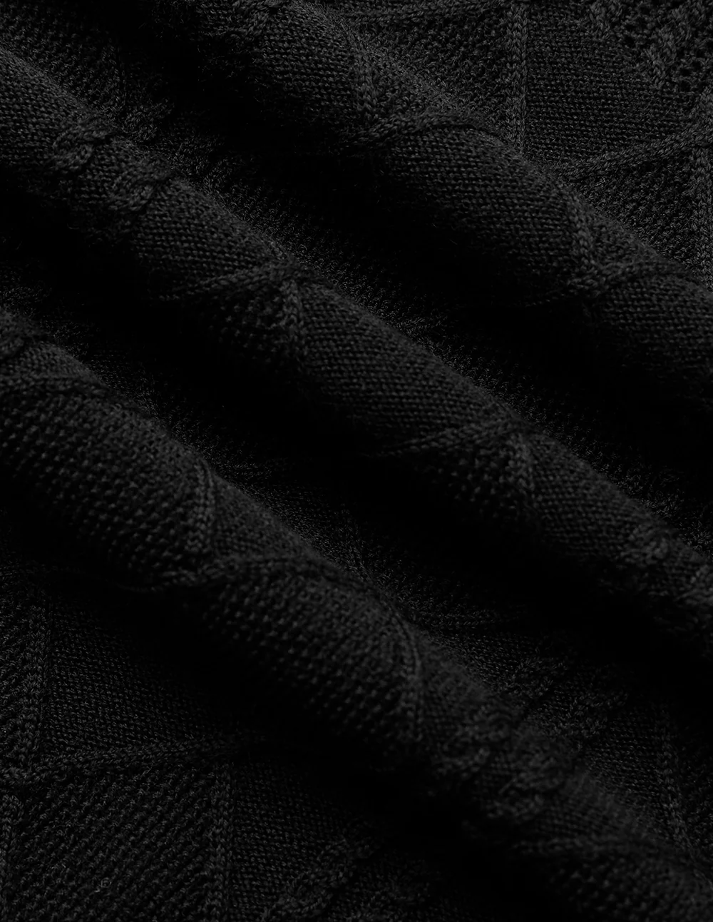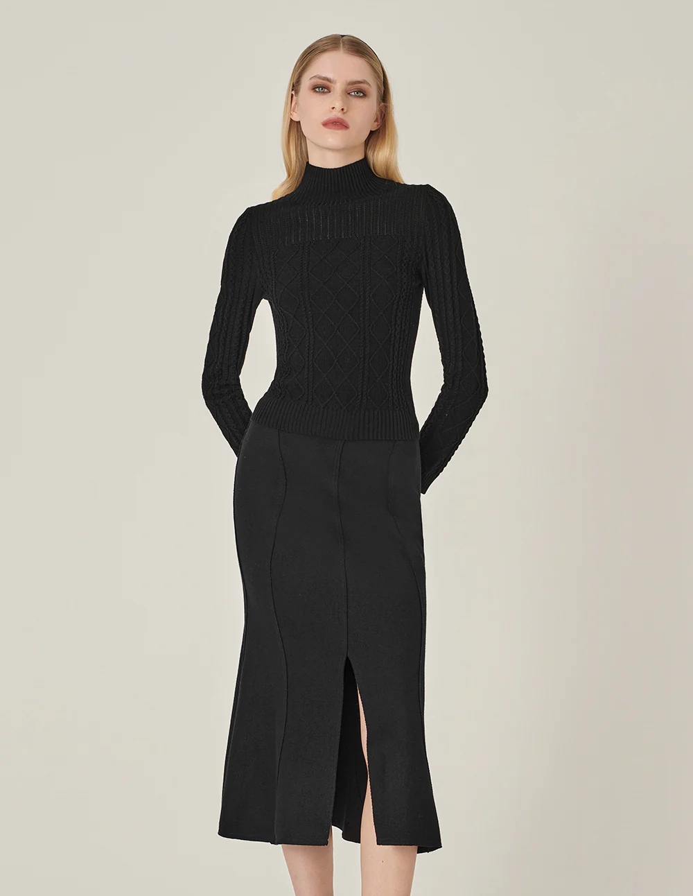 MARYLING’sknittedsweateradoptsahalf-highcollarstylethatissimpleandelegant.Theclassicblackcoloriseasiertomatch.Theperforatedfronttissuebreaksthedullnessandrevealsthesexycharm.Therichtissuepatternsaredelicateandtextured.Itisafashionableoutfitforautumnandwinter.Matchingseparates.FitTruetosize,chooseyournormalsizeCompositionBody:100%sheepwoolRib:83.5%sheepwool14.6%nylon1.9%spandexWashingmethodDonotwashableDonotbleachLayflattodryIronsoleplatemaximumtemperature110¡æMilddrycleaningReminder:Payattentiontomoisture-proofandmoth-proofwhenstoring