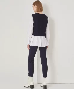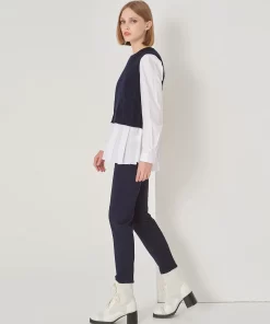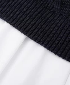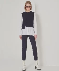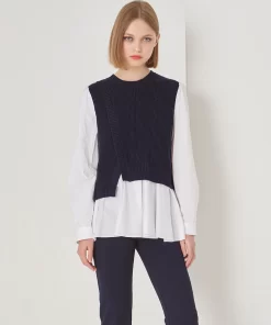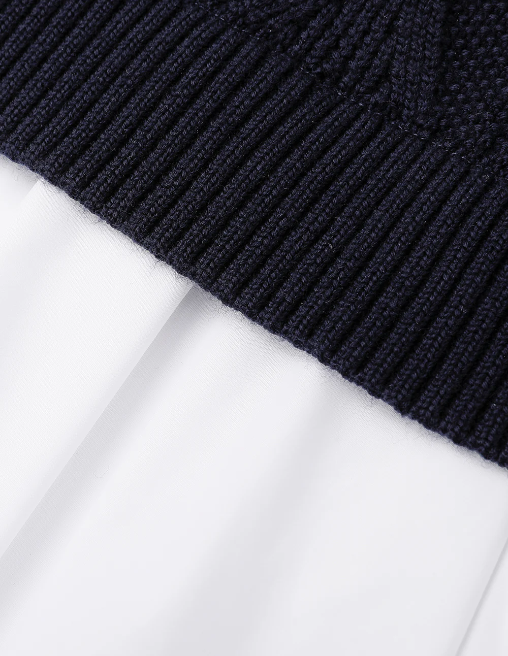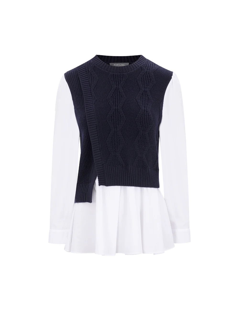 MARYLING’sneedleshuttletopismadeofblueandwhitecontrastingcolourwoolandwhitecottontocomplementeachother.Therichbuttonropestructurechangeshaveamoretexturedfeeling.Thehemismatchedwithpleatedwovenfabrics,whicharelivelyandsmart,relaxedandcomfortable.Suitableformanybodytypes.FitTruetosize,chooseyournormalsizeCompositionWovenmaterial:87.2%polyesterfiber12.8%CottonKnitmaterial:100%sheepwoolWashingmethodHandwashMaxwashingtemperature40¡æDonotbleachLayflattodryIronsoleplatemaximumtemperature110¡æRegulardrycleaningReminder:Payattentiontomoisture-proofandmoth-proofwhenstoring
