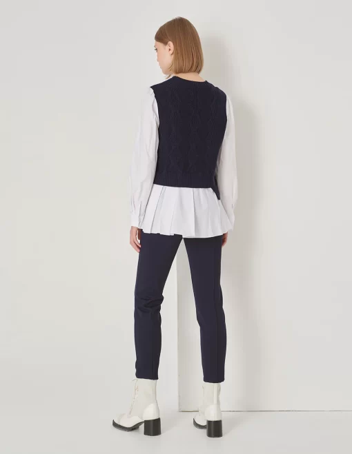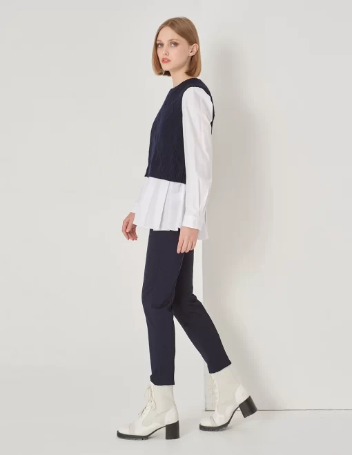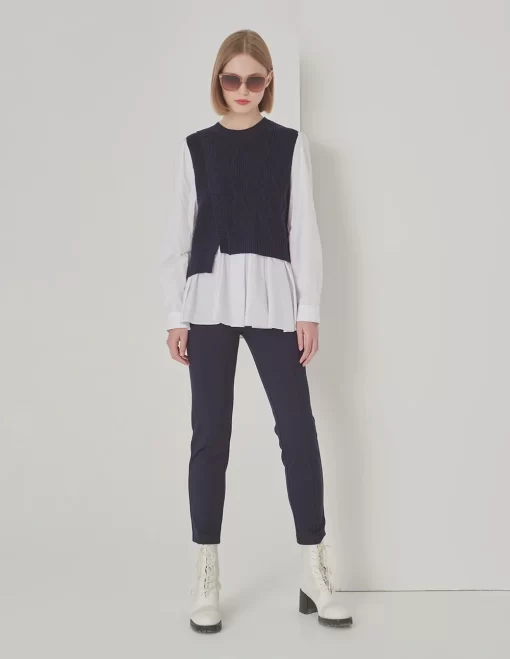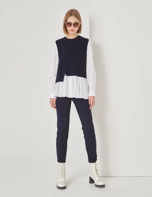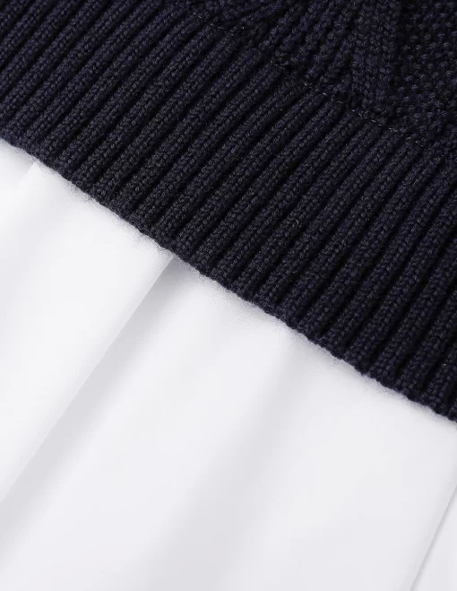 MARYLING’sneedleshuttletopismadeofblueandwhitecontrastingcolourwoolandwhitecottontocomplementeachother.Therichbuttonropestructurechangeshaveamoretexturedfeeling.Thehemismatchedwithpleatedwovenfabrics,whicharelivelyandsmart,relaxedandcomfortable.Suitableformanybodytypes.FitTruetosize,chooseyournormalsizeCompositionWovenmaterial:87.2%polyesterfiber12.8%CottonKnitmaterial:100%sheepwoolWashingmethodHandwashMaxwashingtemperature40¡æDonotbleachLayflattodryIronsoleplatemaximumtemperature110¡æRegulardrycleaningReminder:Payattentiontomoisture-proofandmoth-proofwhenstoring