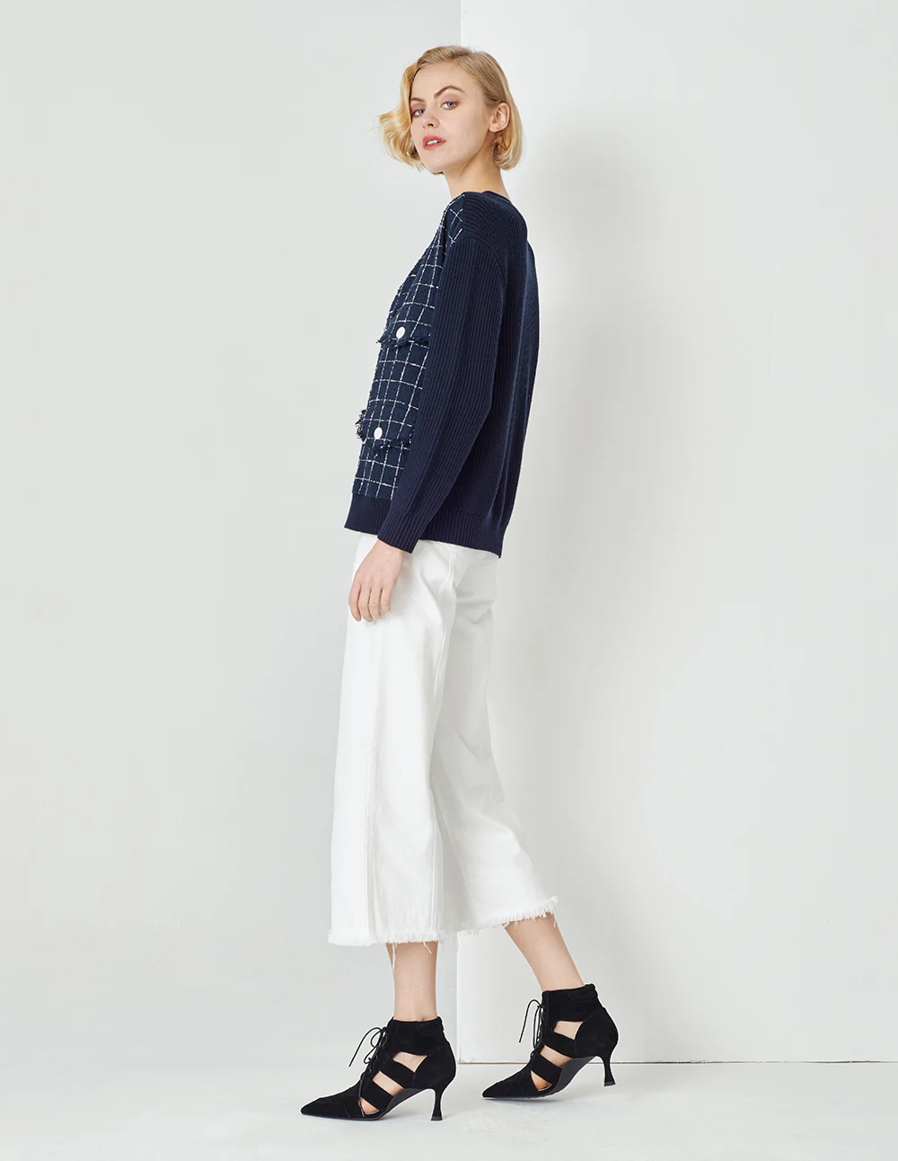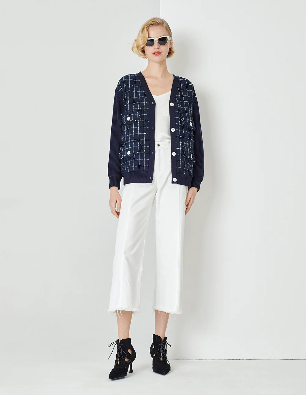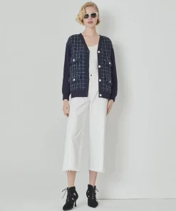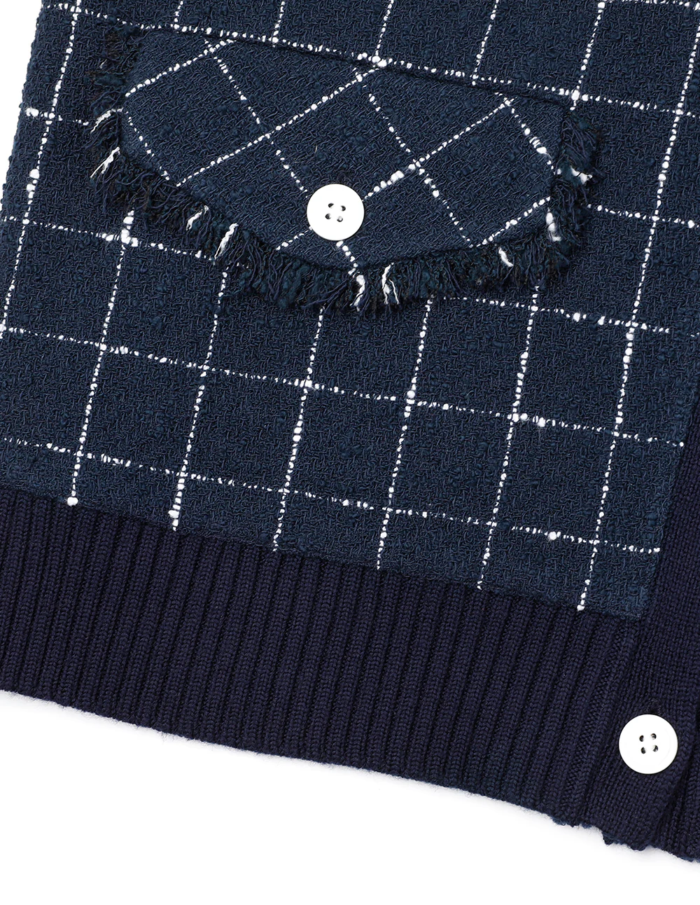 MARYLINGknittedV-neckcardigan.Thefrontpanelisdarkblueandwhiteplaidtweedstitchedwithasolidwoolknit.Themulti-pocketdesigndecoratedwithfringesisyouthful,fashionable,andeasytocoordinate.FitTruetosize,chooseyournormalsizeCompositionMainmaterial:90.0%cotton10.0%nylonCollisionmaterial:100%sheepwoolRib:96.7%SheepWool3.1%Nylon0.2%SpandexWashingmethodDonotwaterwashingDonotbleachLayflattodryIronsoleplatemaximumtemperature110¡æRegulardrycleaningReminder:Payattentiontomoisture-proofandmoth-proofwhenstoring
