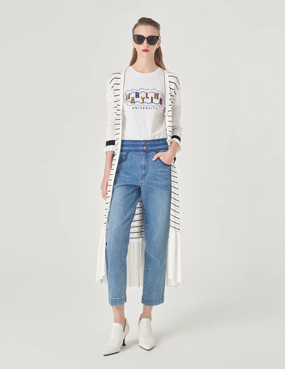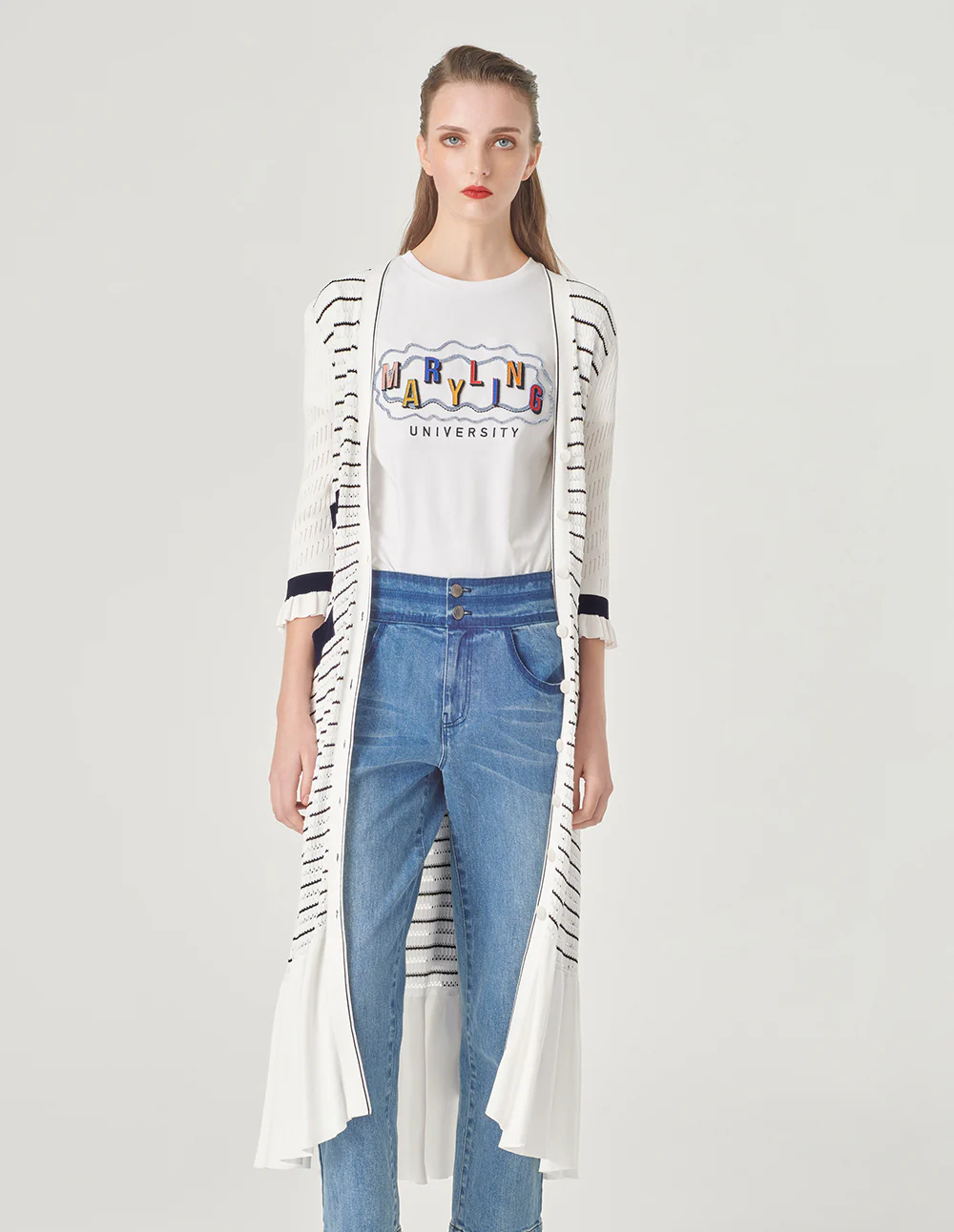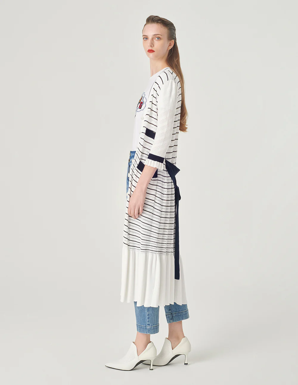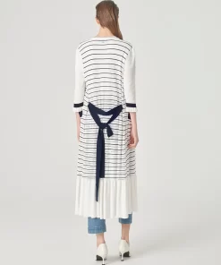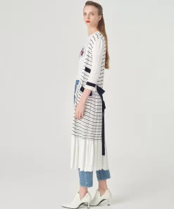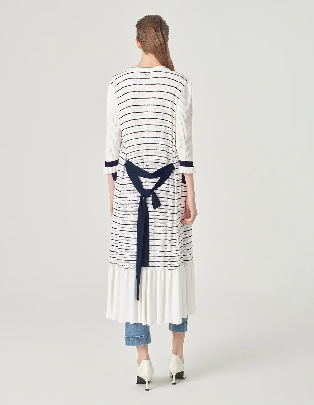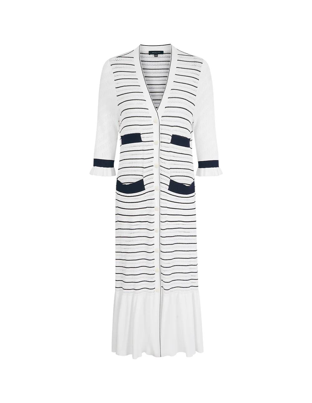 MARYLING’sknittedcardiganismainlywhitewithdarkbluestripedpatterns.Thelightandthinstyleexudesacoolsummerfeel,andthedeepV-necklongcardiganstyleshowsoffyourtemperament.FitTruetosize,chooseyournormalsizeCompositionBody:61.4%viscose30.5%nylon8.1%polyesterfilmfiberCollarpatch,belt,bagflap:66.6%viscose33.4%nylonSleeves:80.8%viscose19.2%nylonRib:79.3%viscose20.7%nylonWashingmethodHandwashMaxwashingtemperature40¡æDonotbleachLayflattodryIronsoleplatemaximumtemperature110¡æMilddrycleaningNote:IronafterwashingReversesidewashing