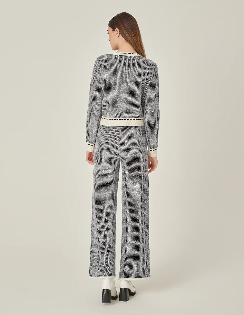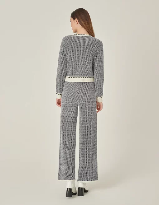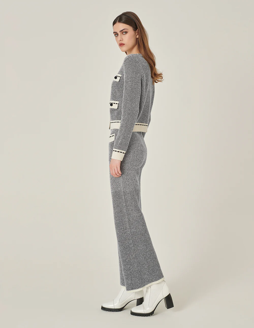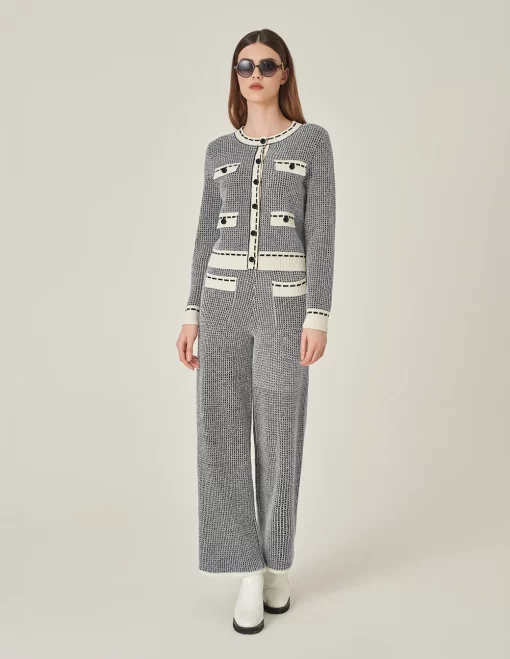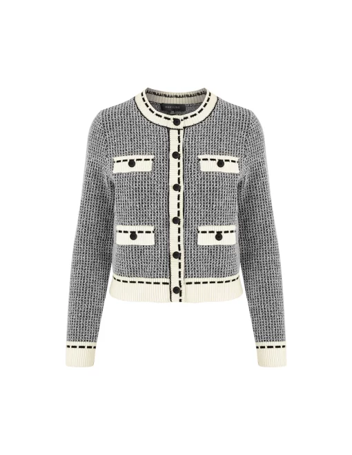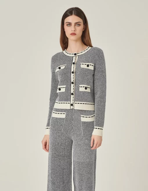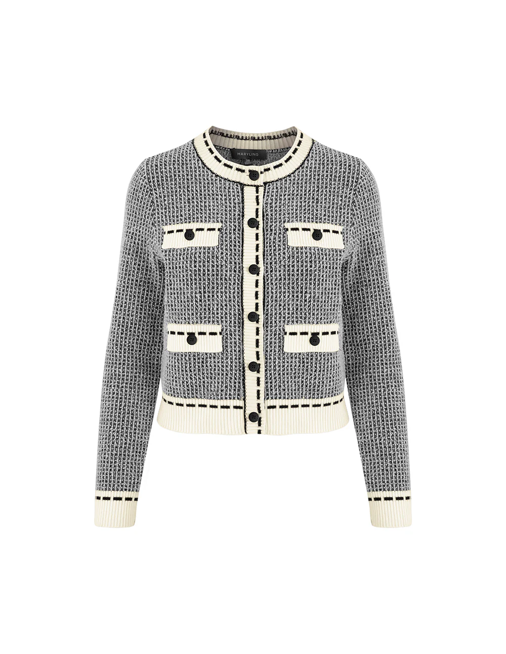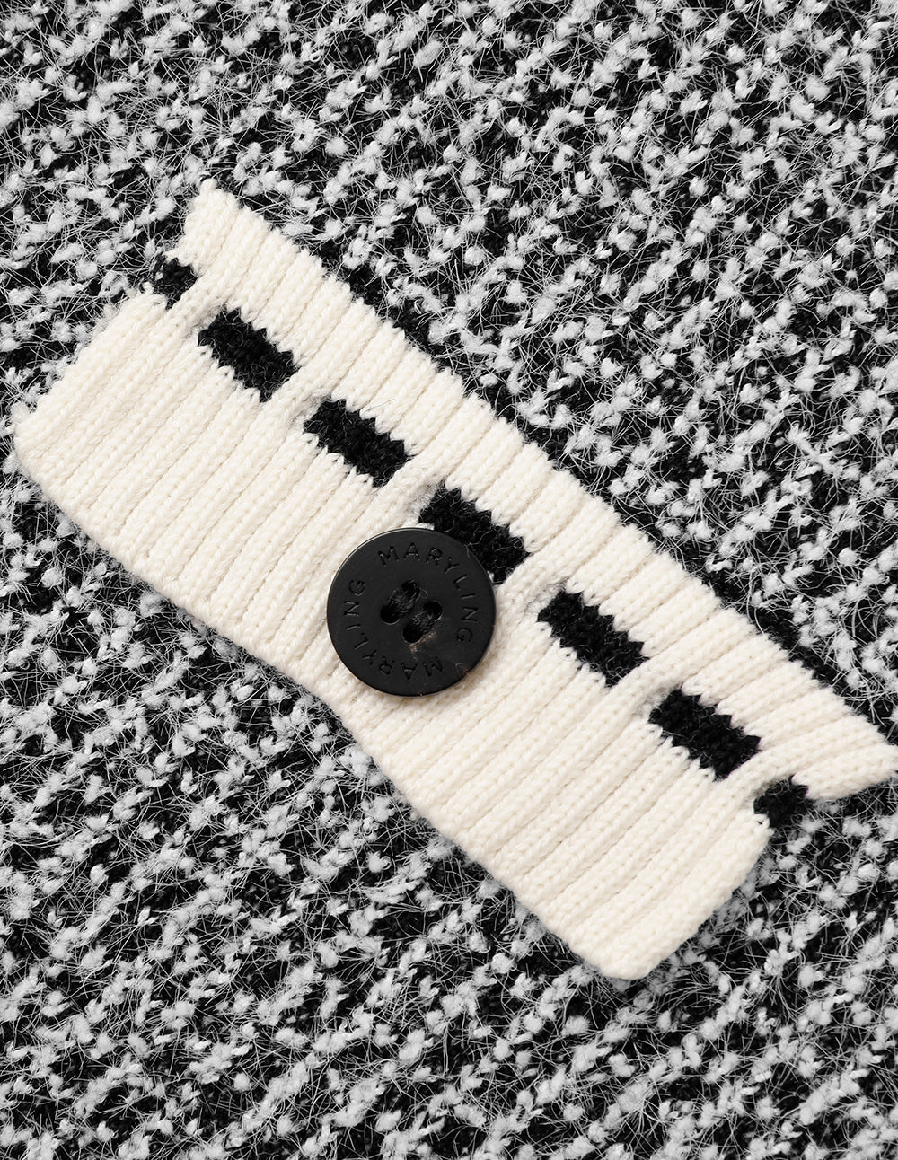 MARYLING’sclassicround-neckcardiganismixedwithblackandwhiteyarnstocreateatweedeffect.Thedecorativedottedlinesoutlinepockets,collarsandotherstructurallines,makingpeoplefeelfreshandenergetic.Itcanbepairedwithknittedpantsfromthesameseries.Easilycreateastreetlook.FitTruetosize,chooseyournormalsizeCompositionBody:blackyarn:100%sheepwoolWhiteyarn:100%nylonRib:94.7%sheepwool5.3%nylonWashingmethodDonotwashableDonotbleachLayflattodryIronsoleplatemaximumtemperature110¡æMilddrycleaningReminder:Payattentiontomoisture-proofandmoth-proofwhenstoring
