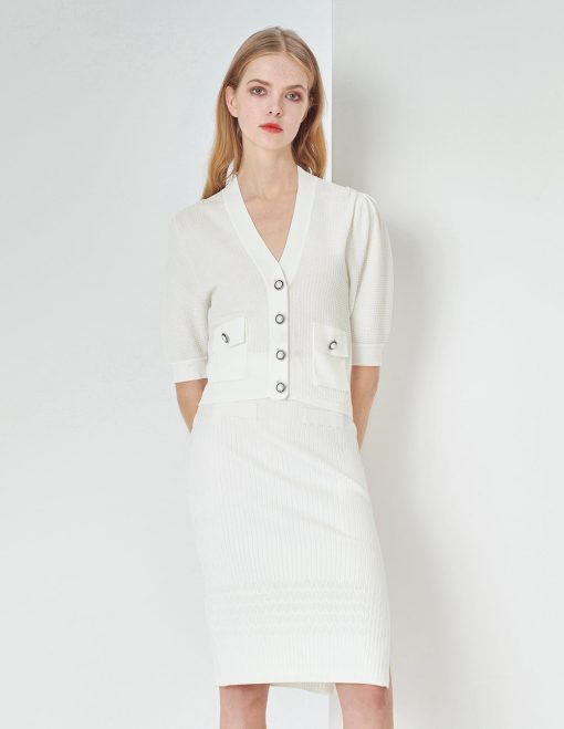 MARYLING Off-White V-Neck Pearl Button Short-Sleeved Knitted Cardigan WHITE | NEW IN