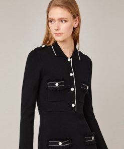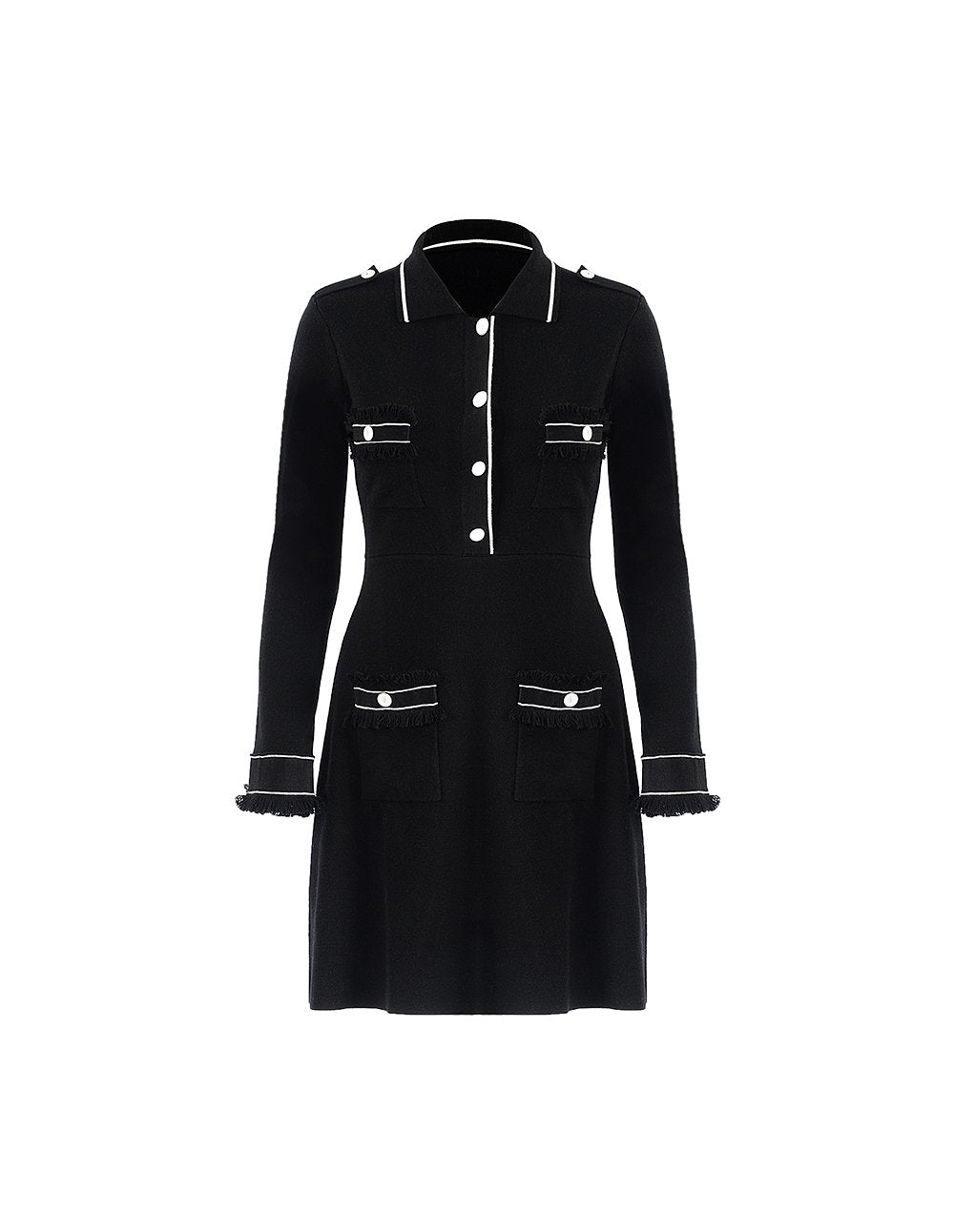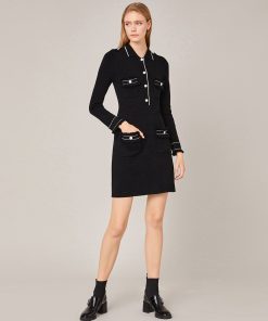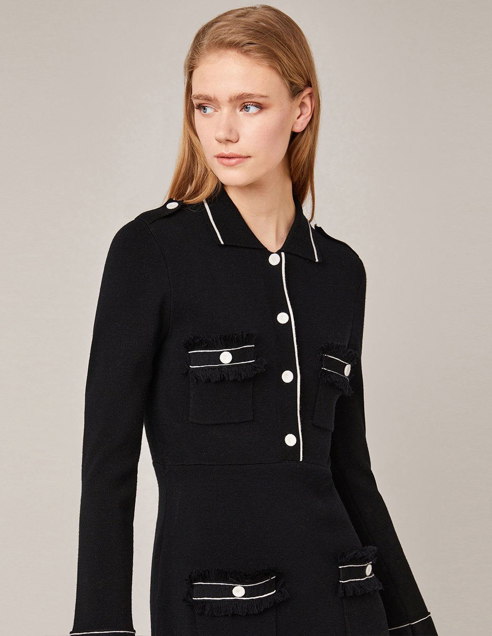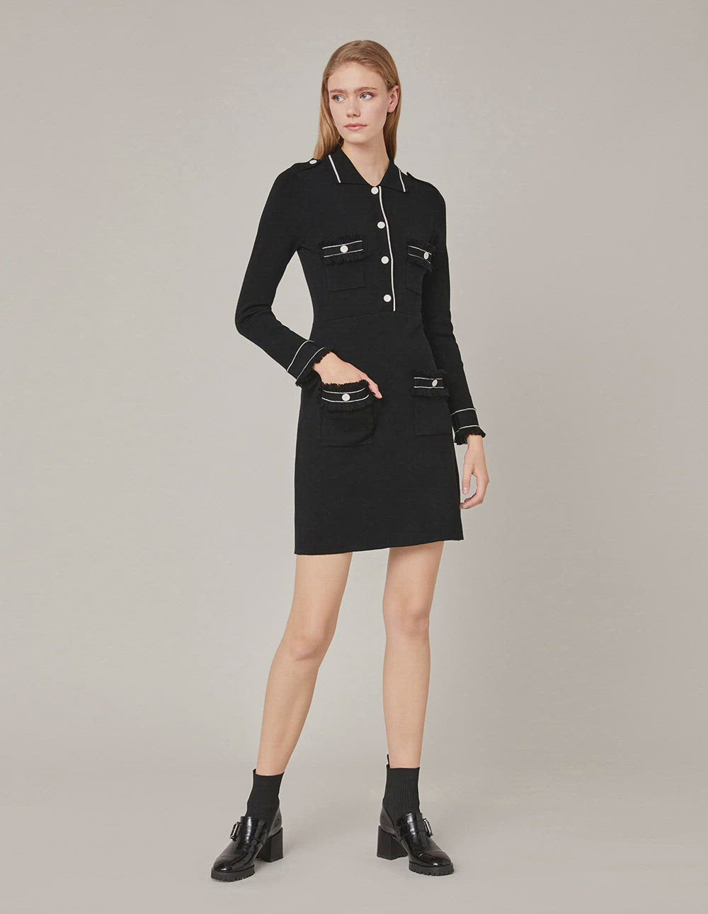Monochromeminidressfeaturingapolo-inspiredcollarandaccentedwhitetrimandbuttons.Tailoredinaform-fittingstylethisdresshasversatileappealworkingforbothofficeandleisureoccasions.Knittedskirtdesign,classicblackandwhitecolor,fashionableandpracticalWoolblendedmaterial,warmandsoft,skin-friendlyandcomfortableFuzzydesign,fullofingenuityFitTruetosize,chooseyournormalsizeCompositionMAINFABRIC:84.6%SHEEPWOOLFIBER13.8%POLYAMIDE1.6%POLYURETHANEWashingmethodHandwash,themaximumwashingtemperatureis40a??br>DonotbleachDryflatThemaximumtemperatureoftheironsoleplateis110a??br>EasedrycleaningNote:needtobeironedafterwashingReminder:payattentiontomoistureandmoth-proofduringstorage